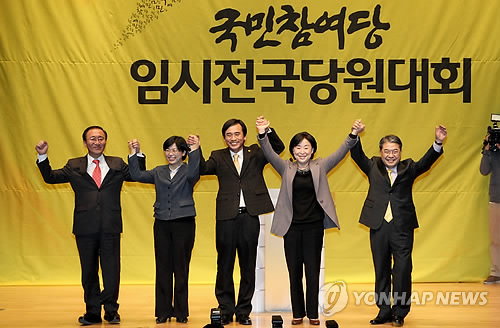 왼쪽부터 통합연대 노회찬 공동대표, 민노당 이정희 대표, 국민참여당 유시민 대표, 통합연대 심상정 공동대표, 국민참여당 이재정 전 대표. 2011. 12. 4